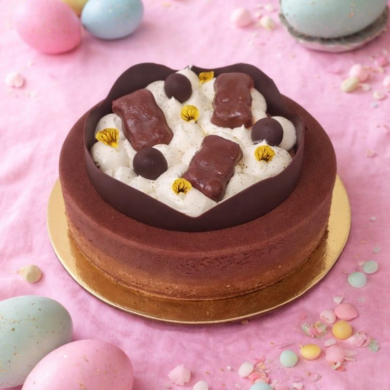 Une création de Pâques gourmande où le chocolat noir rencontre la douceur d’un crémeux vanillé sur un brownie noisette.